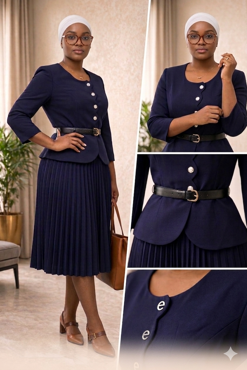 Silver button detail. Belted waist. Pleated skirt. Every inch designed to command respect.